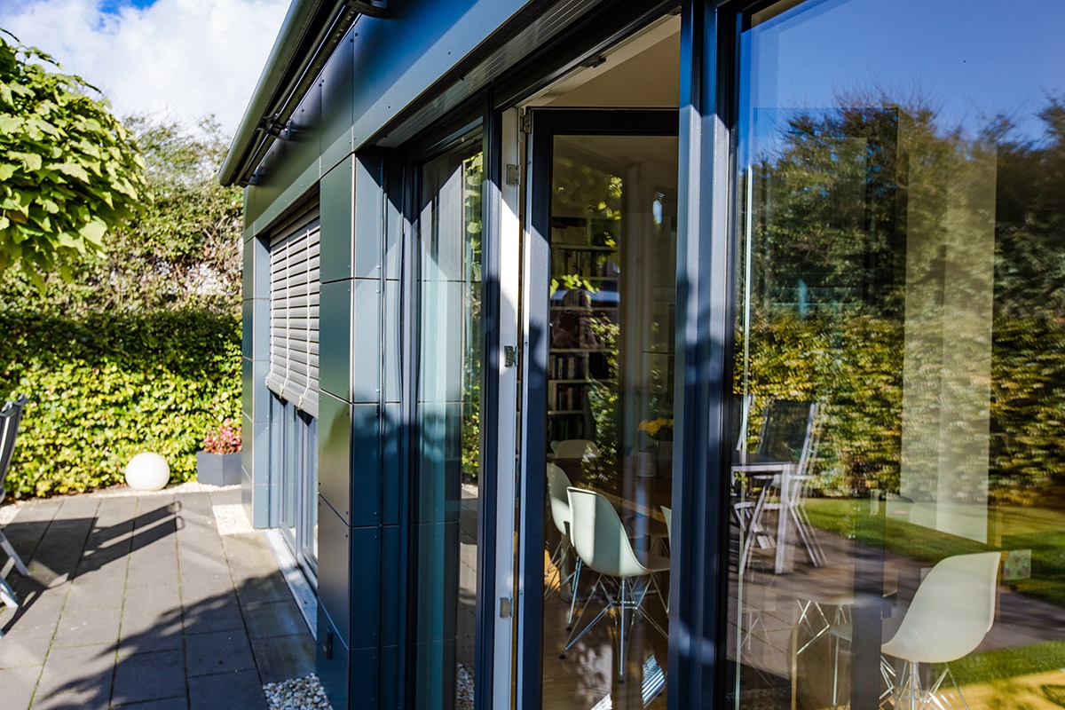 Geschmacklich top ist auch das äußere Erscheinungsbild des Anbaus: Die Linienführungen der Fenster und Türen aufnehmend, konzipierten wir eine außergewöhnliche Fassadenbekleidung mit HPL-Platten in Anthrazit. HPL steht für „High Pressure Laminate“.
