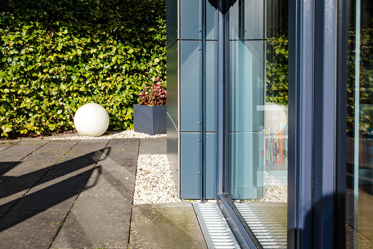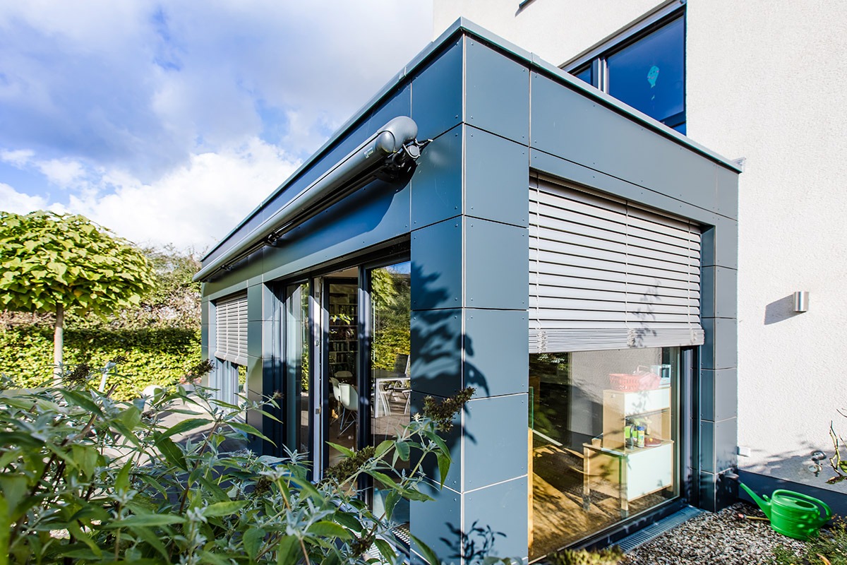 Für den gesamten Anbau wurde die einfarbige Variante in Anthrazit gewählt, um das edle Erscheinungsbild durch Einheitlichkeit zu betonen. Hierzu haben wir die 2 x 5 Meter großen Platten in unserer Werkstatt auf Maß geschnitten. Dabei achteten wir insbesondere darauf, dass die vertikalen und horizontalen Fugen gemeinsam mit den Kanten der Glaselemente und dem Raffstore-Sonnenschutz eine klare, geradlinige Front bilden.