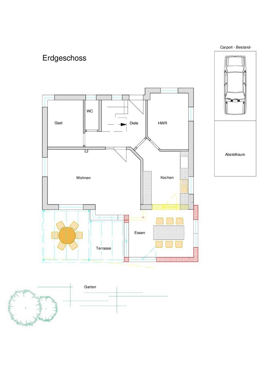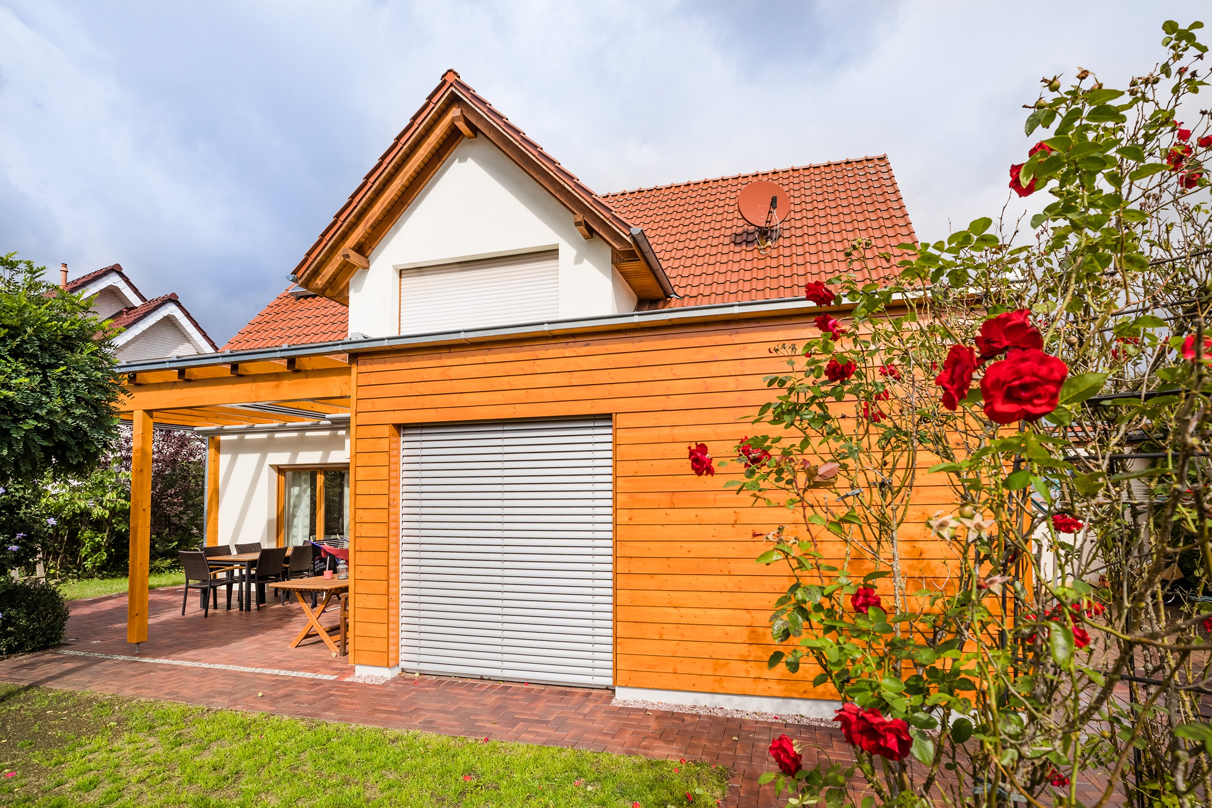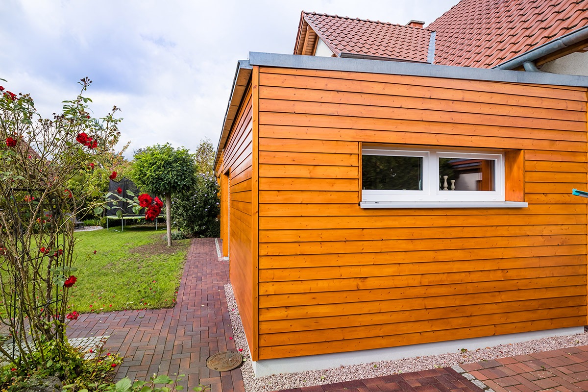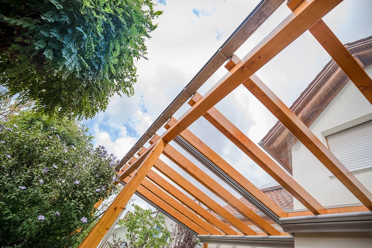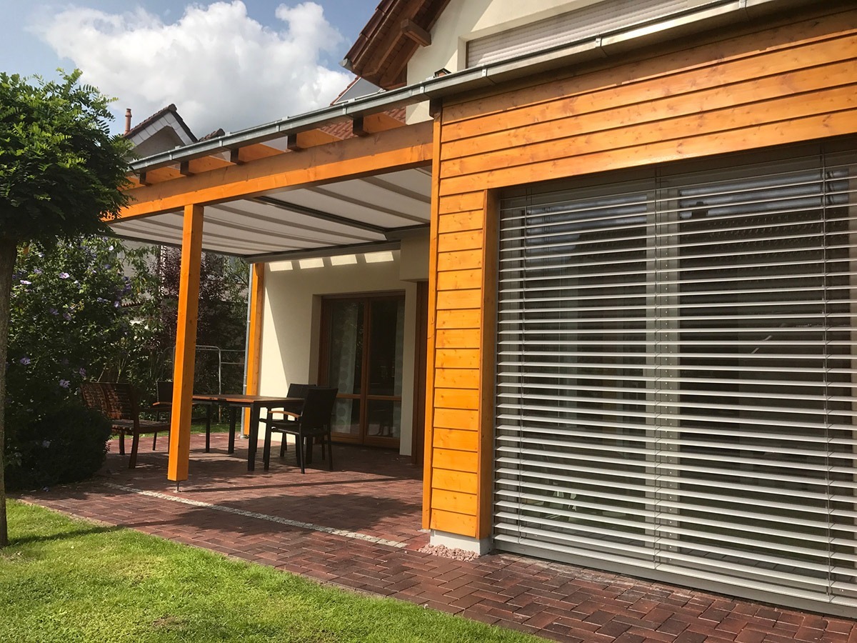 Hinzu kam eine hochwertige Überdachung der Terrasse. Im Außenbereich entstand auf diese Weise ein 20 m2 umfassender offener Raum für den nachhaltigen Genuss. Das lasierte Fichtenholz sowohl der Anbaufassade als auch der Überdachung schafft eine gelungene optische Einheit.