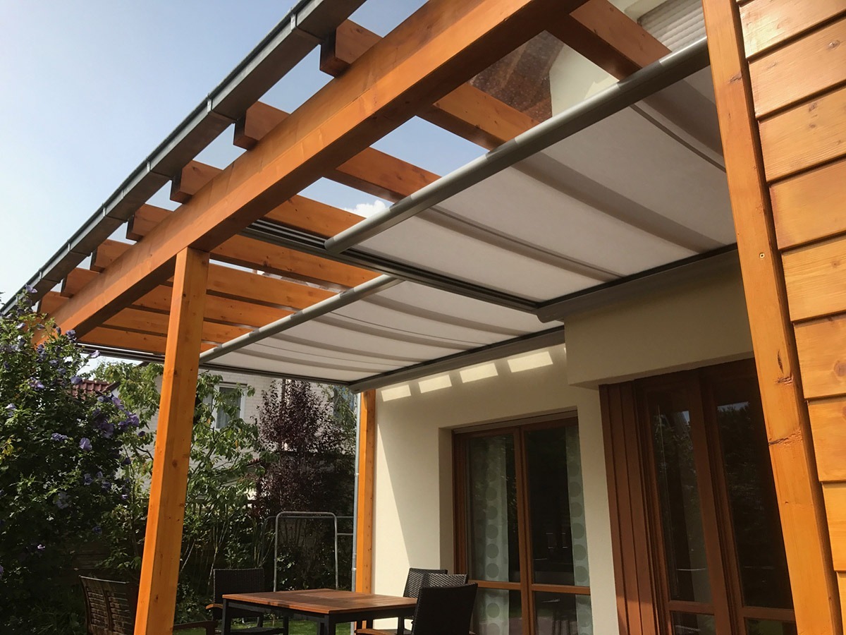 Um den Platz an der Sonne jederzeit genießen zu können, wurden Sonnenschutz-Markisen unterhalb des Sicherheitsglases angebracht. Die Terrasse verfügt nun über zwei Zugänge: einerseits – wie bereits vor dem Umbau – zum Wohnzimmer, andererseits zum neuen Küchenbereich.
