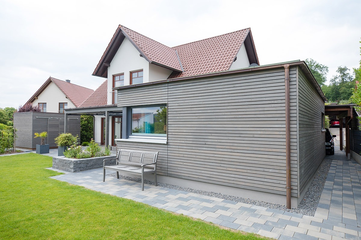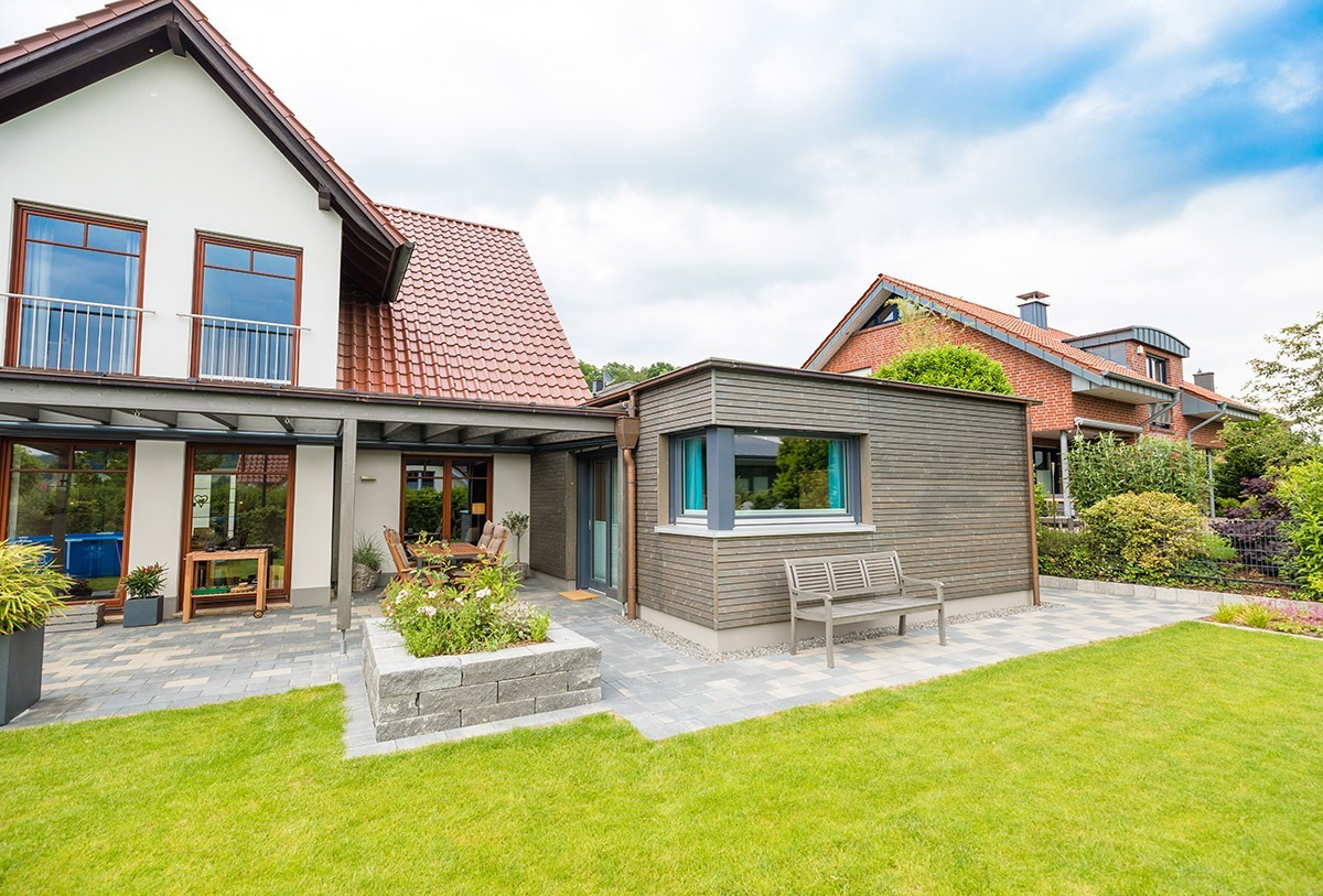 Optisch bilden der neue Anbau, die Terrassenüberdachung und das Gartenhäuschen auf der Südseite des Bissendorfer Einfamilienhauses eine attraktive Einheit. Zugleich setzt sich das Ensemble von der Architektur des Bestandsgebäudes, das rund 15 Jahre zuvor errichtet wurde, deutlich ab.