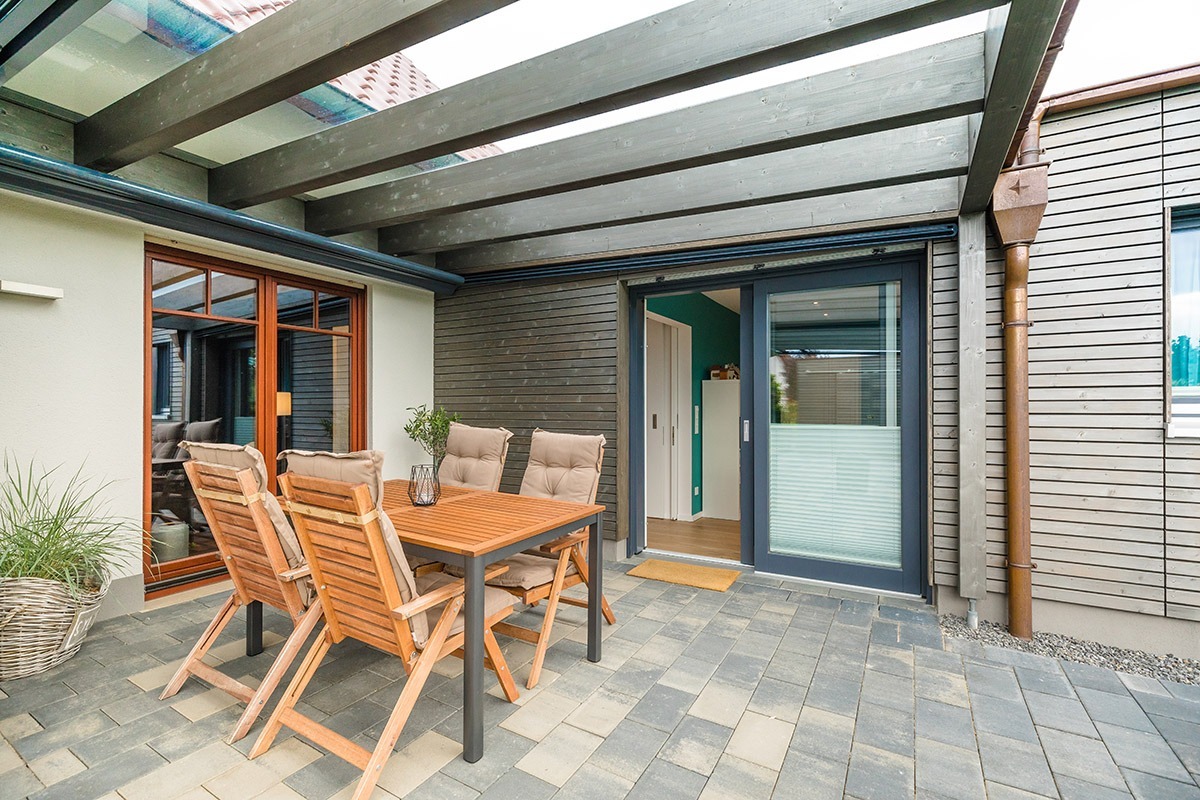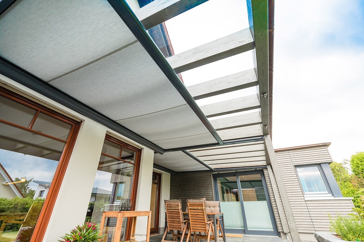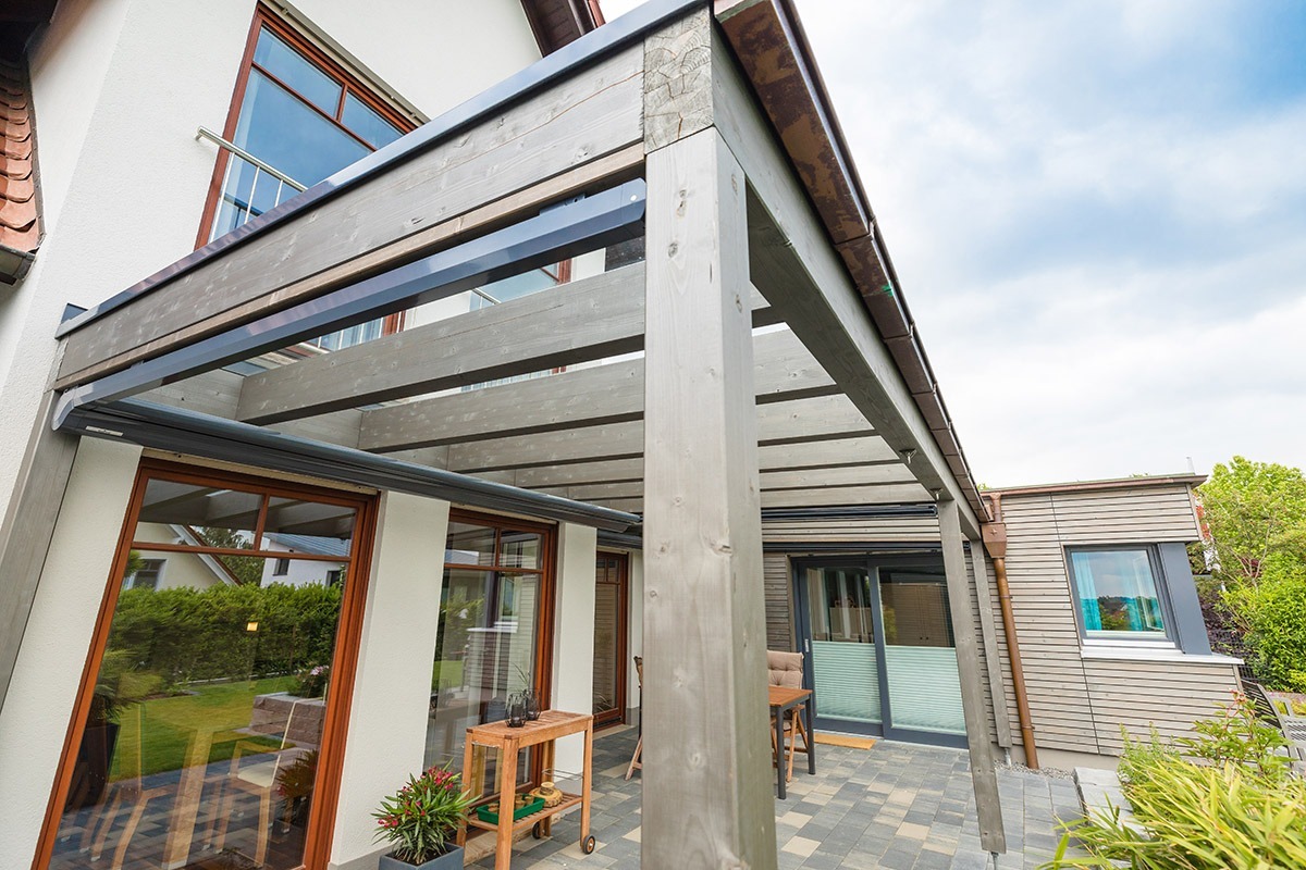 Das neue, rund 33 Quadratmeter messende Terrassendach verbindet nun den Anbau außen mit dem Bestandsgebäude. Das Dach besteht aus Sicherheitsglas, darunter befindet sich eine ausfahrbare Markise. So können die Bewohner hier ganz flexibel Sonne oder Schatten genießen.