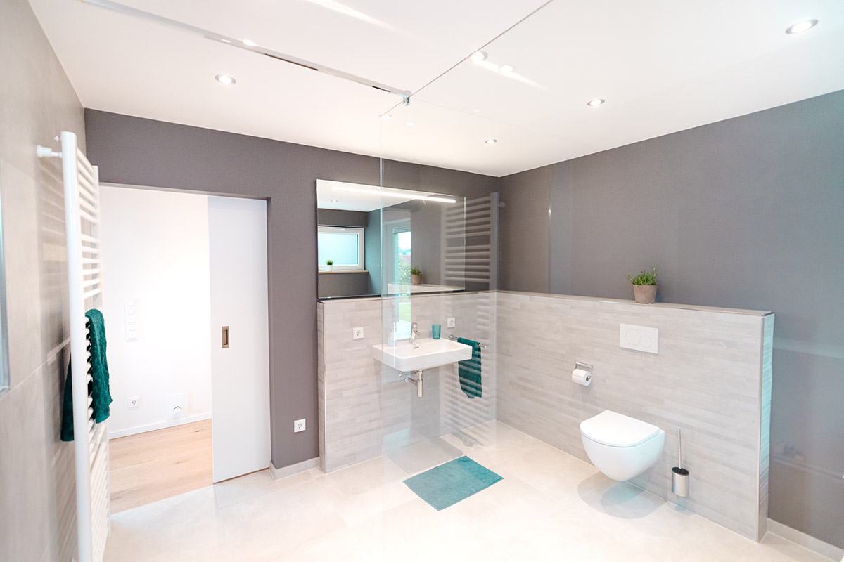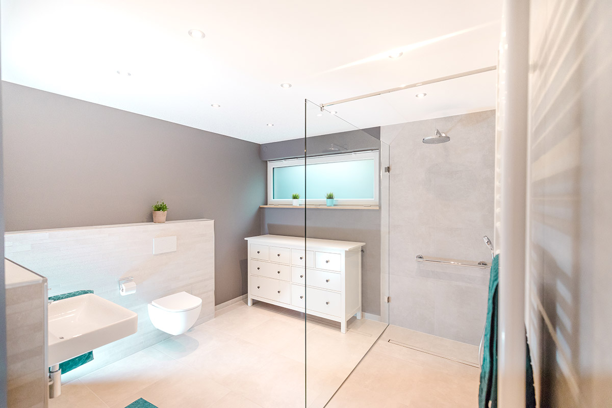 Bei der Erweiterung der Wohnfläche war Barrierefreiheit eine entscheidende Vorgabe. Auf rund 40 Quadratmetern im Anbau ist der ebenerdig zugängliche Wohnraum hell und freundlich gestaltet, und das Bad bietet auch für Menschen mit eingeschränkter Bewegung maximalen Komfort – inklusive bodengleicher Dusche und unterfahrbarem Waschtisch. Die bei allen Projekten von Heggemann übliche sehr gute Dämmung sorgt überdies für ein angenehmes Raumklima.
