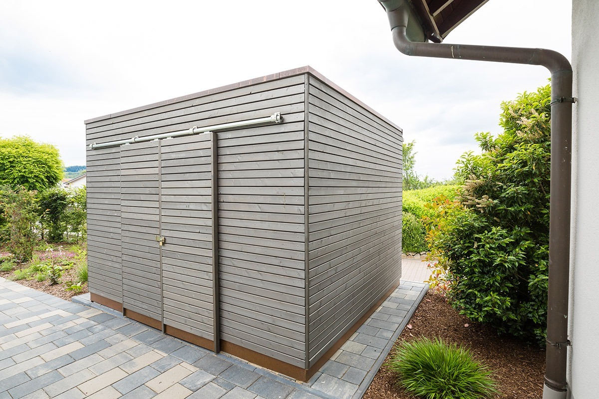 Komplettiert wird das Trio durch die Gartenhütte, die knapp 10 Quadratmeter umfasst und von Heggemann für das bequeme Verstauen von Gartengeräten & Co. mit Schiebetoren versehen wurde.