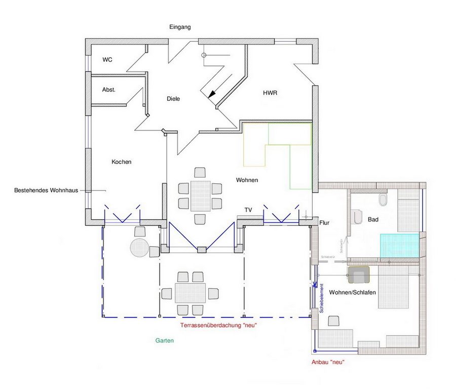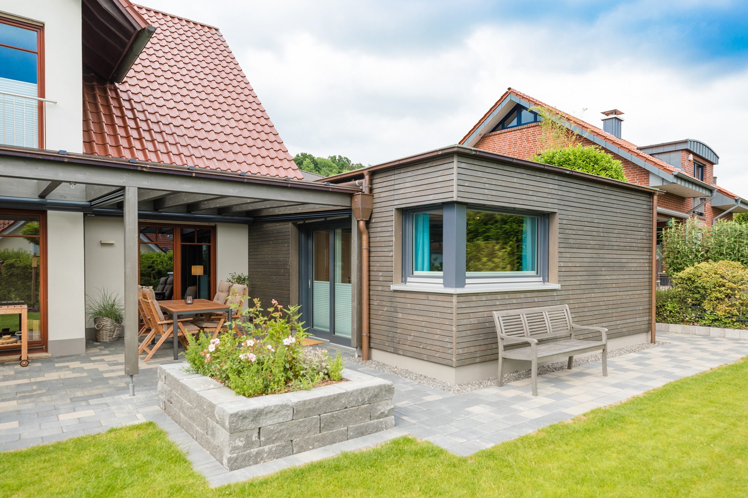 Anbau, Terrasse und Gartenhaus aus einem Guss