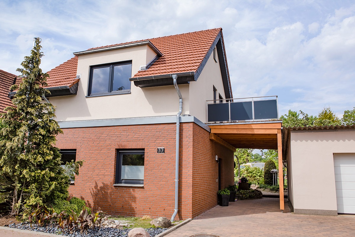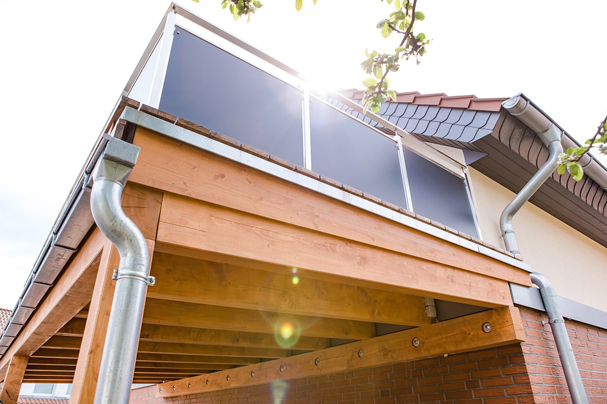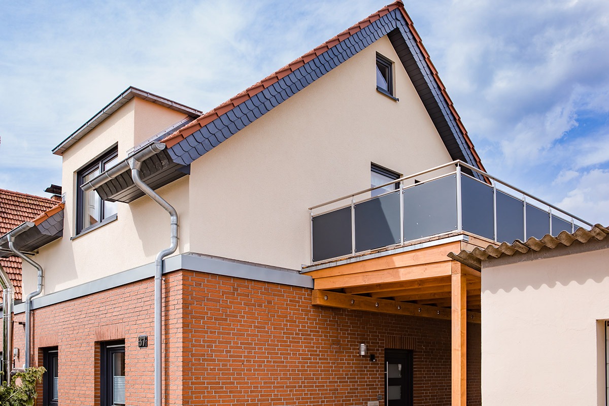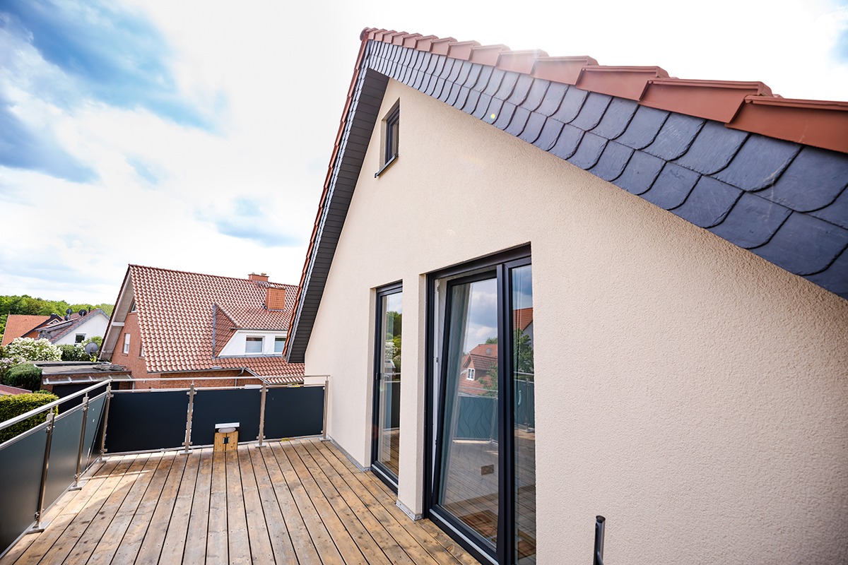 Zusätzliche Lebensqualität bietet der neue Balkon an einer Giebelseite, der zum Genießen der Sonne einlädt. Diesen Holzbalkon hat Heggemann ebenso ausgeführt wie die gesamte Gebäudehülle mit Dach, Fenstern, Fassade und Dämmung.