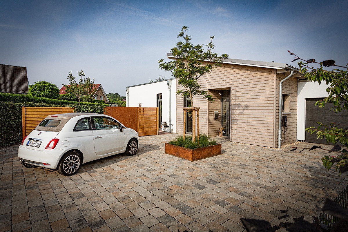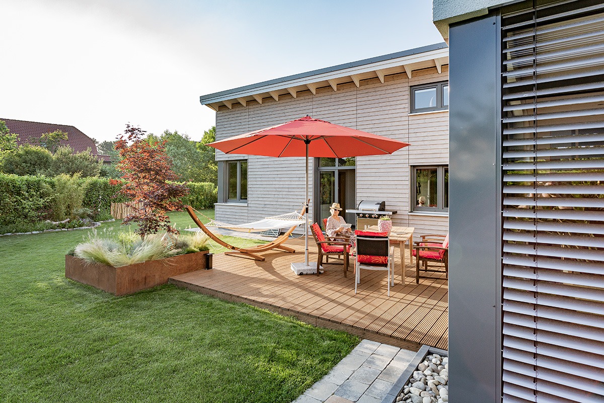 Der komplett in Holzrahmenbauweise erstellte Bungalow wartet daher mit einigen besonderen Finessen auf. So wurde durch den L-förmigen Grundriss eine Art Innenhof geschaffen, der zum Verweilen im Garten einlädt. Außerdem wurde das Gebäude in zwei Bereiche aufgeteilt – der eine mit einem Pultdach, der andere mit einem Flachdach. Dies allein sorgt bereits für eine deutliche Auflockerung der Optik.