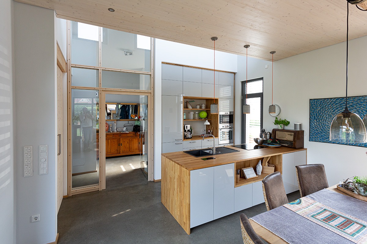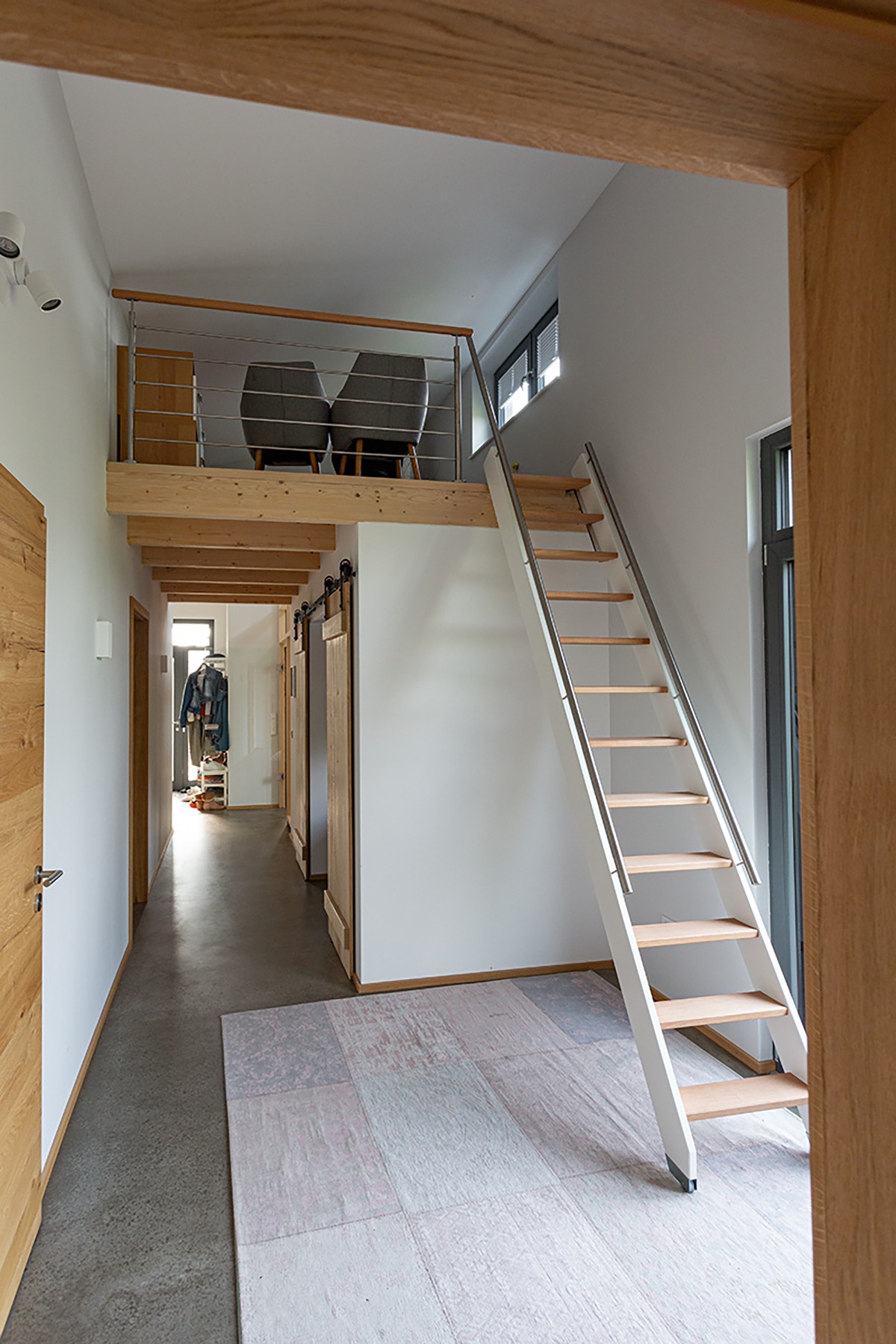 Eine Besonderheit des Pultdach-Bereichs: Hier wurde vom Grundprinzip einer ebenerdigen Anordnung aller Wohnflächen leicht abgewichen. Über eine Leiter, die sich platzsparend einfach an die Wand schieben lässt, ist durch die Einschubdecke ein zusätzlicher Rückzugsraum erreichbar, in dem auch Gäste untergebracht werden können.