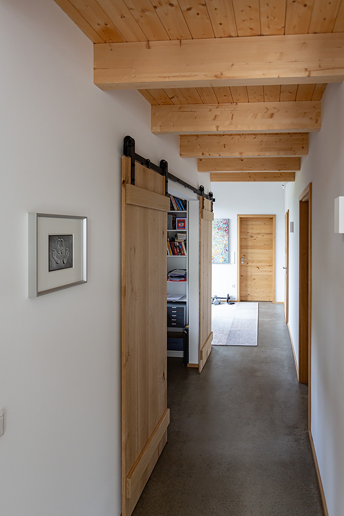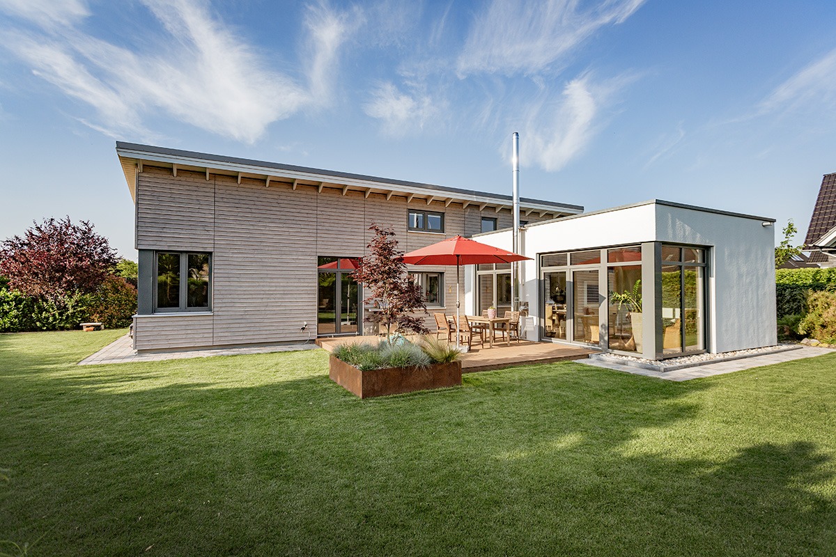 Hinzu kommen die unterschiedlichen Fassaden: Während der Baukörper mit dem Pultdach eine Holzverschalung mit einem Stülpschalungsprofil aus Fichte mit grauer Holzschutzlasur besitzt, wurden die Wände des Flachdach-Blocks – sowie der Garage und des ihr angeschlossenen Nebenraums für Gartengeräte – klassisch verputzt.