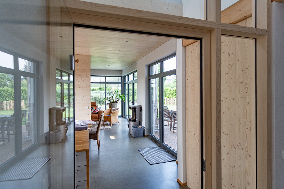 Große Fenster, die für viel natürliches Tageslicht sorgen, die schöne Fichtenholzdecke, eine stilvolle Einrichtung und nicht zuletzt der außergewöhnliche Boden schaffen ein hochwertiges Ambiente: So wurde der Beton lediglich poliert und versiegelt, aber nicht durch einen Bodenbelag verdeckt. Diese puristische Gestaltung ergibt einen interessanten Kontrast zu den zum Teil sichtbaren Holzbalken unter der Decke.