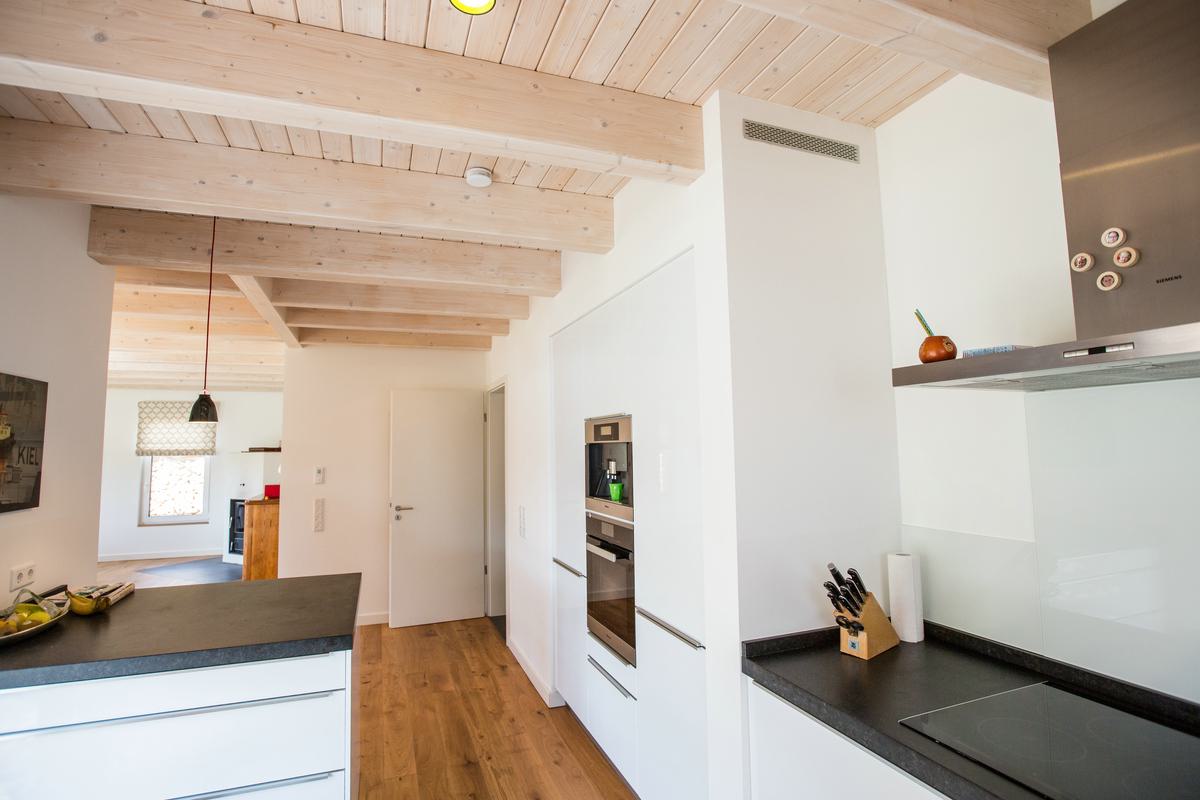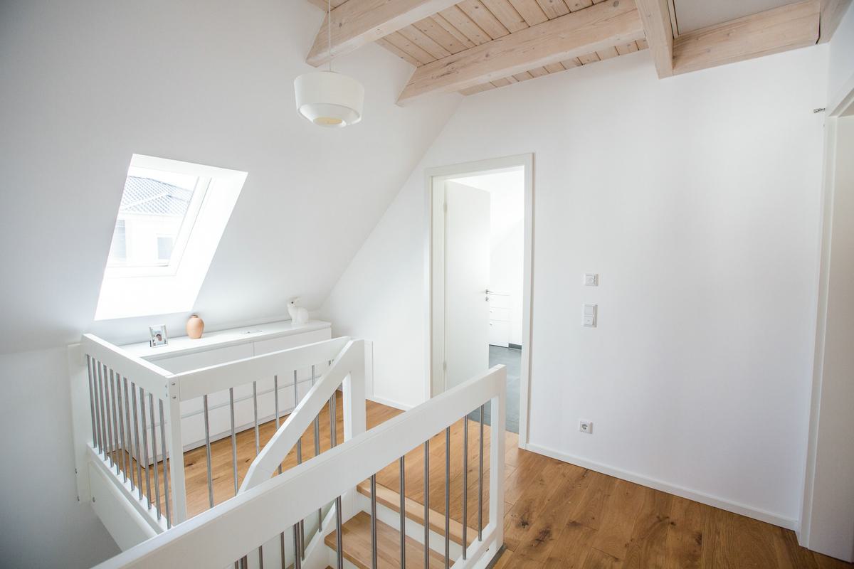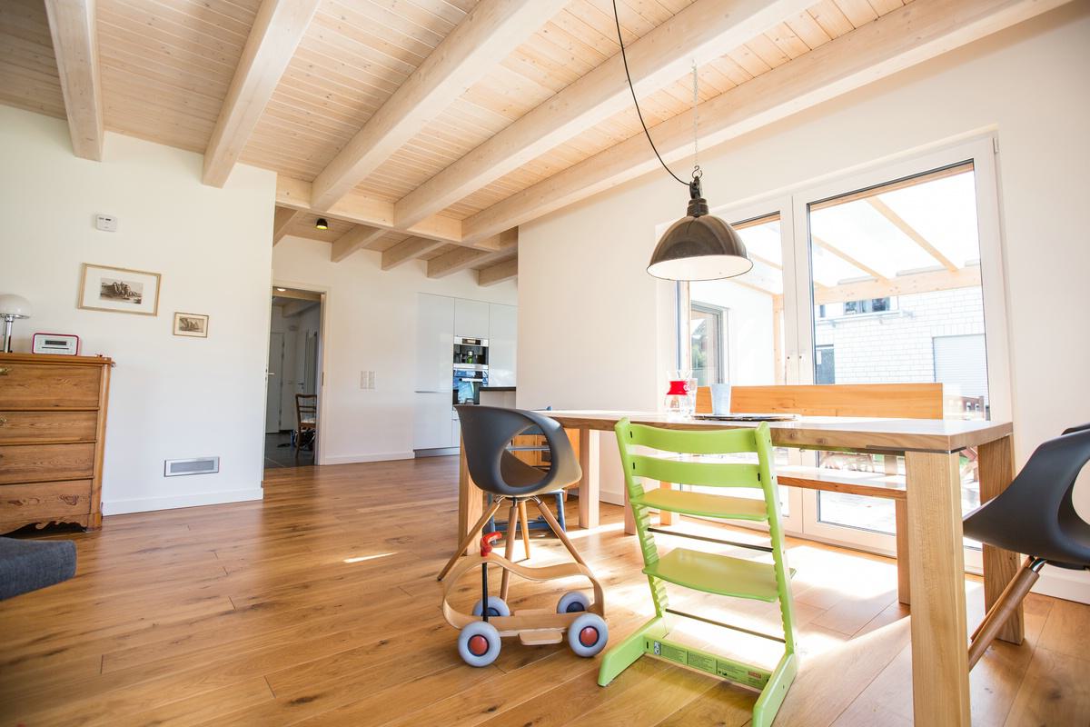 Wer jetzt denkt, dies sei „Wohnbebauung von der Stange“, irrt. Denn schon äußerlich unterscheiden sich einige Gebäudeteile von ihren Nachbarwohnungen durch farbliche Akzente. Hier fällt eine Einheit mit einem markanten Blau ganz bewusst aus dem Rahmen; andere Fassaden unterscheiden sich eher in Nuancen hellerer Töne. Vor allem im Innern bieten sich sehr individuelle Gestaltungsspielräume – angefangen bei der Ausstattung und dem Raumzuschnitt. Auch auf diesem Gebiet nimmt das blaue Haus eine Sonderstellung ein: Das durch ein Fenster im Dach einfallende Sonnenlicht kann durch die in die Zwischendecken eingelassenen, begehbaren Gläser sogar alle drei Geschosse durchfluten. Modernität strahlt das von einem Musiker und seiner Familie bewohnte Effizienzhaus mit der frischen Farbgebung sowohl außen als auch innen aus. Innen erzeugen die sichtbaren Deckenbalken eine gemütliche Wohlfühl-Atmosphäre.