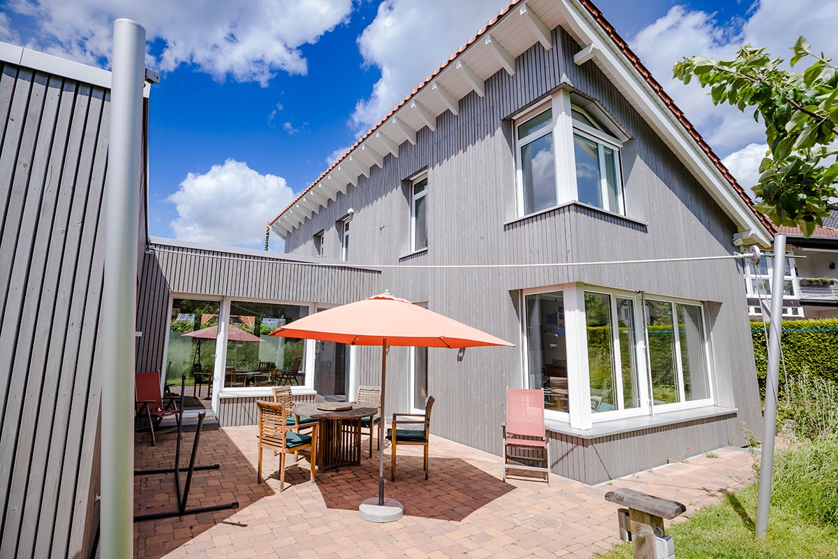 Die Tafelbauweise mit der ansprechenden Holzfassade prägt das Gebäude-Ensemble in jeder Hinsicht – sowohl in Bezug auf die Nachhaltigkeit des Materials und der Bauart als auch auf das Erscheinungsbild. So wurden die Lärchen-Leisten der Fassade „auf Lücke“ an gebracht. Das heißt: Sie sind – vor allem aus rein ästhetischen Gründen – nicht mit Nut und Feder miteinander verbunden, sondern in gleichmäßigen Abständen angeordnet, wodurch die Außenwände weniger massiv erscheinen. Um den edlen Grauton zu erzielen, wurde das Holz mit einer speziellen Vorvergrauungslasur behandelt, die diese patina-ähnliche Oberfläche bewirkt.