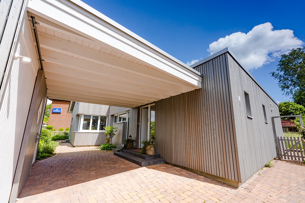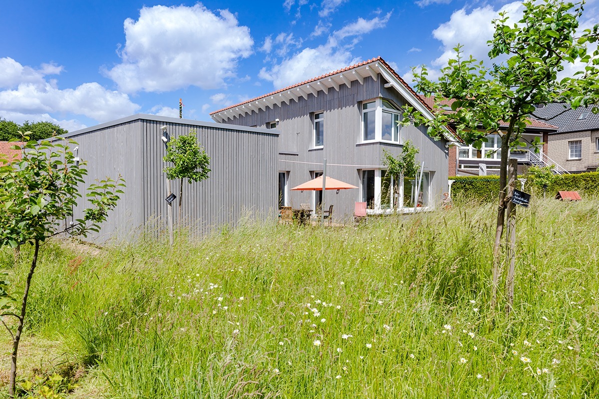 Einerseits sind die Baukörper dieses Einfamilienhauses in Riemsloh klar abgegrenzt – zum Beispiel durch das Pultdach im einen Wohnbereich und das Flachdach im anderen sowie über dem Geräteschuppen und Carport. Andererseits bilden diese Teile optisch eine harmonische Einheit. Und hierbei spielt die außergewöhnliche Holzfassade als verbindendes Element eine wichtige Rolle.
