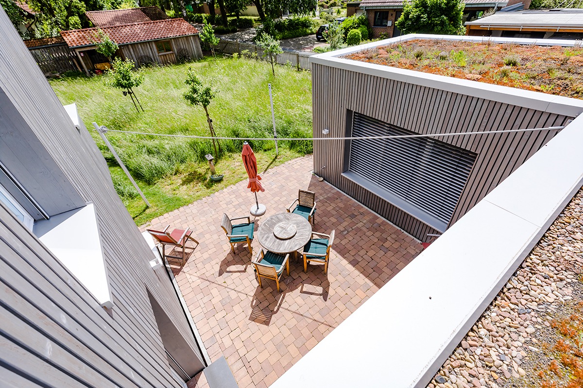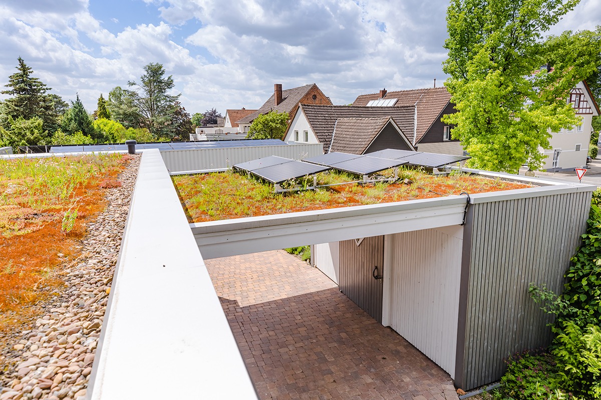 Ökologie hat für die Bauherren einen hohen Stellenwert. Deshalb sind die Flachdächer mit Begrünungen versehen. Somit bieten sie nicht nur zusätzlichen attraktiven Lebensraum für Insekten, sondern wirken auch der Flächenversiegelung entgegen und verbessern das Mikroklima, denn das Regenwasser kann nach und nach verdunsten, anstatt über die Kanalisation abgeleitet zu werden.