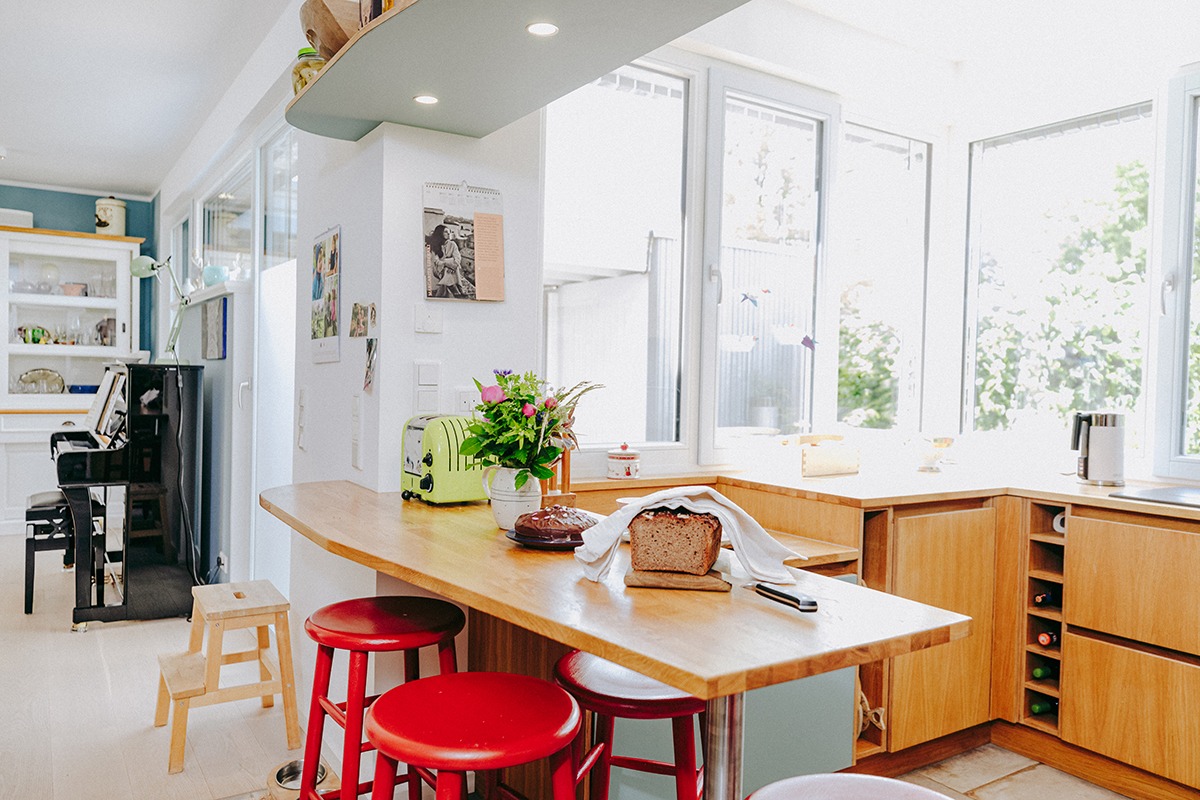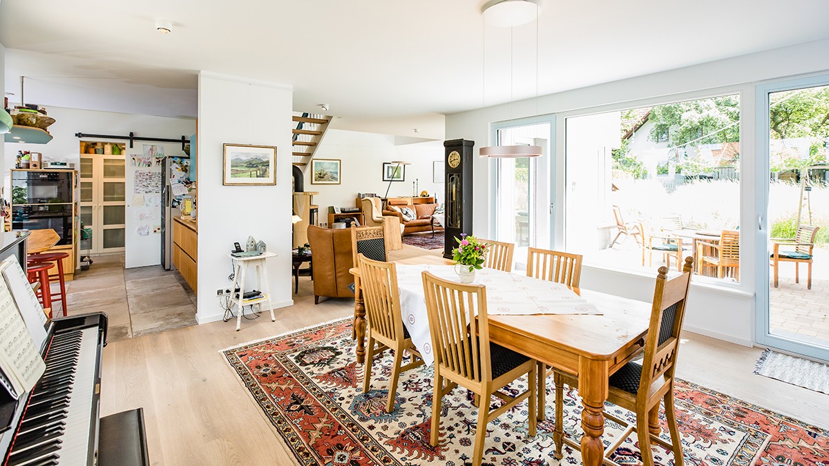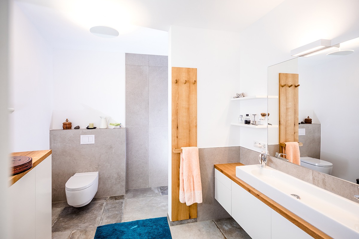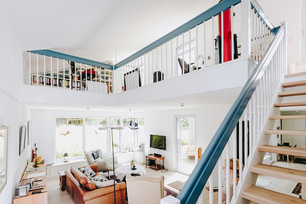Auch das Interieur glänzt mit durchdachter Architektur: Lebensbereiche wie Bad und Schlafzimmer einerseits sowie Kochen, Essen und Wohnen andererseits sind jeweils sinnvoll miteinander kombiniert. Eine Besonderheit ist die großzügige, offene Galerie: Sie verbindet die obere und die untere Wohnebene miteinander und ist auch dank des Pultdaches und der hierdurch ermöglichten zusätzlichen Fenster des Halbgeschosses lichtdurchflutet und freundlich.