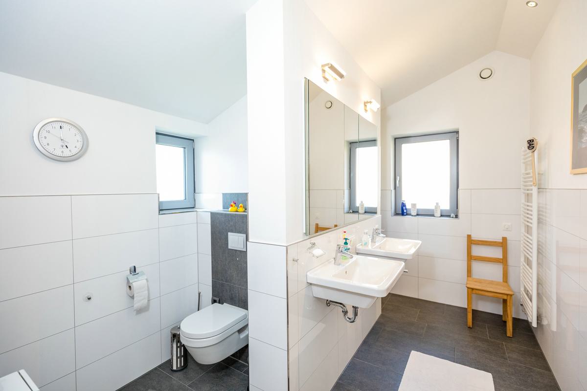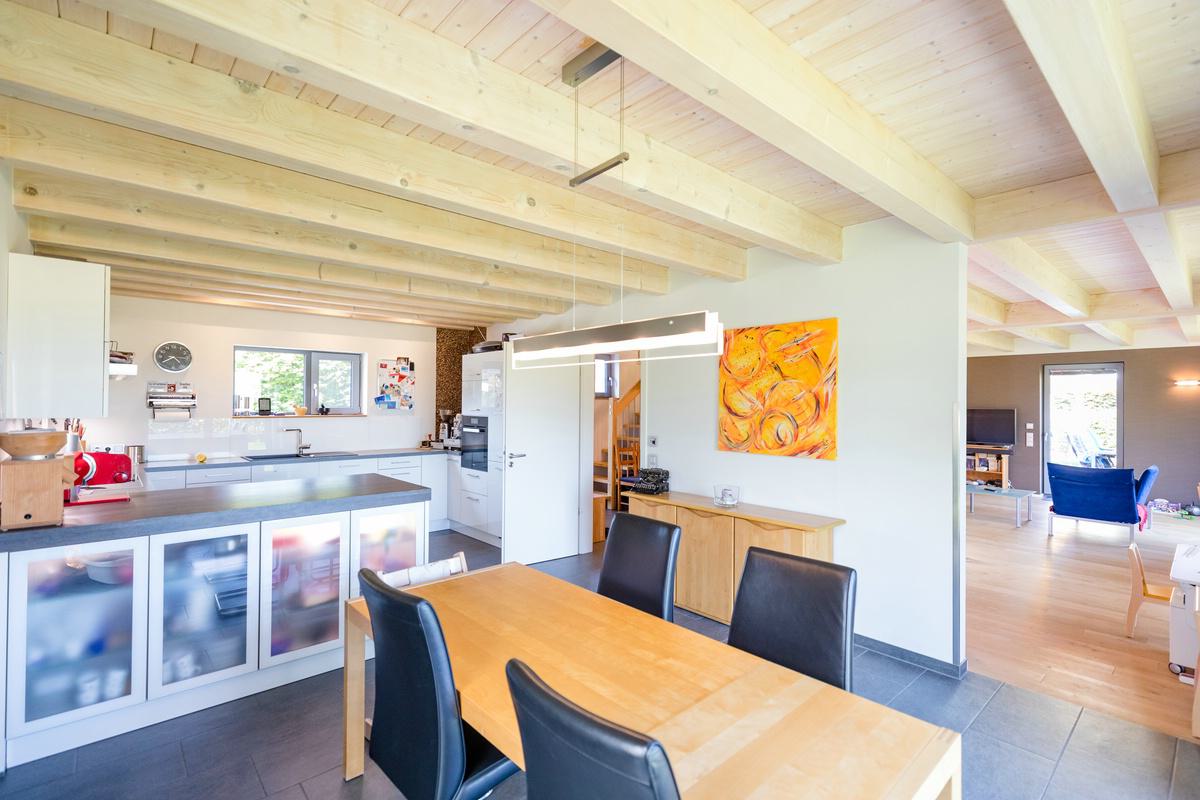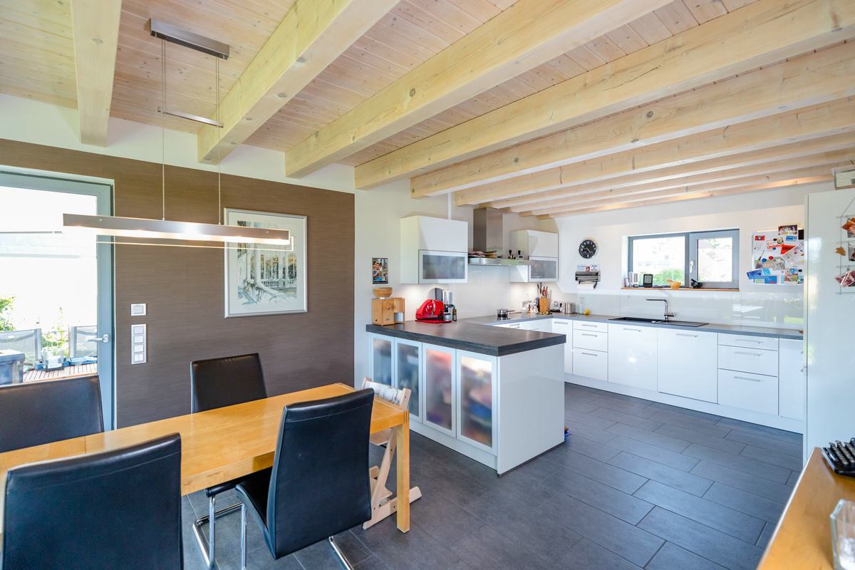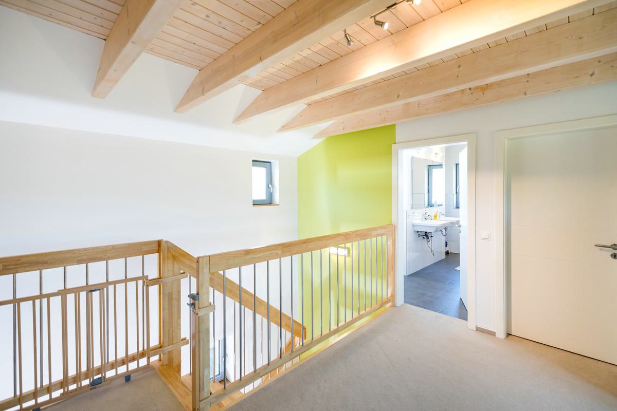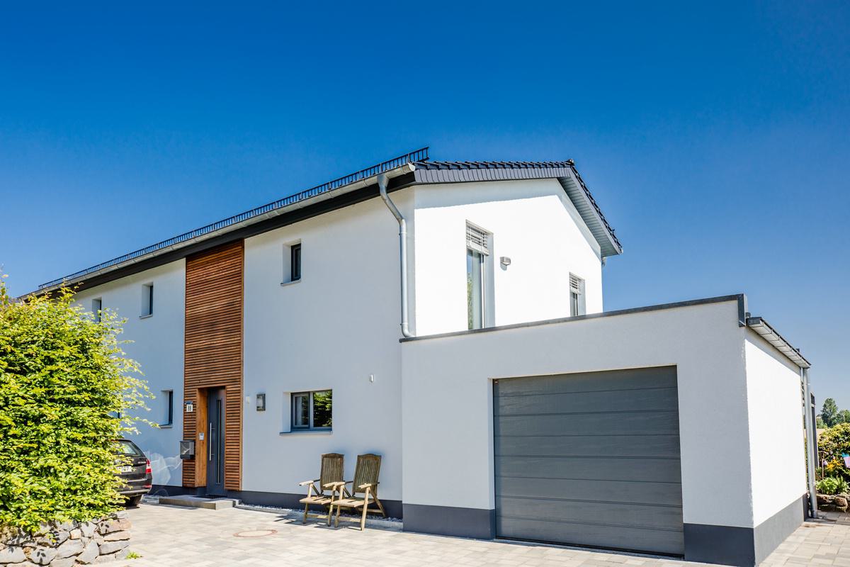Dieses Einfamilienhaus mit Putzfassade überzeugt durch eine aufgelockerte Gestaltung, bei der die Stülpschalung das Erscheinungsbild optisch ansprechend unterbricht. Das Haus wurde schlüsselfertig realisiert und ist mit einer Wärmepumpe sowie einer Lüftungsanlage mit integrierter Wärmerückgewinnung ausgestattet. Große Fensterflächen sorgen für ein lichtdurchflutetes Zuhause. Herzstück des Hauses ist die offene Wohnküche, die zum gemeinsamen Leben einlädt. Auf Wunsch der Baufamilie entstand im Obergeschoss ein zusätzlicher Wohn- und Arbeitsbereich, der flexibel genutzt werden kann.