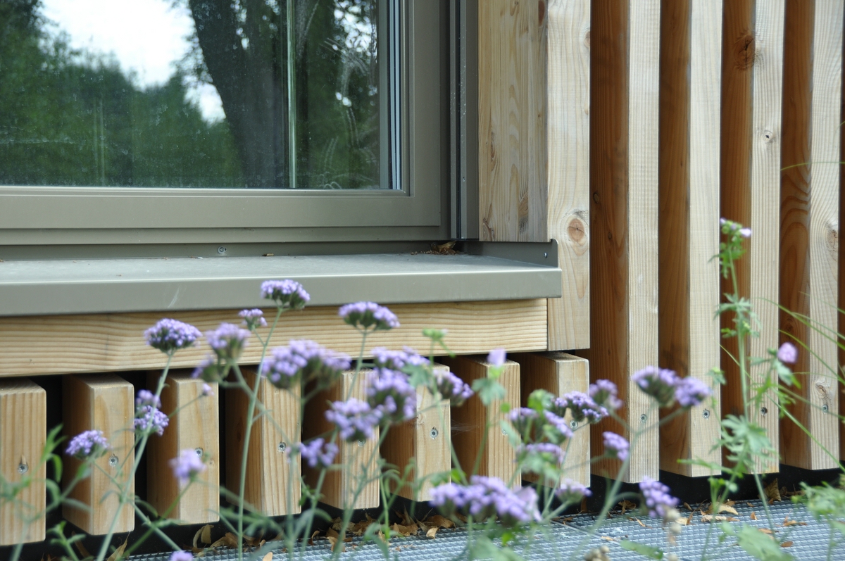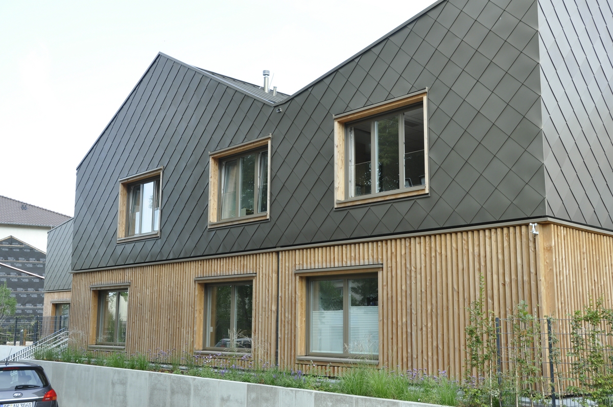 Aluminium Rauten im Sonderfarbton / Echtholzfassade senkrecht Douglasie natur