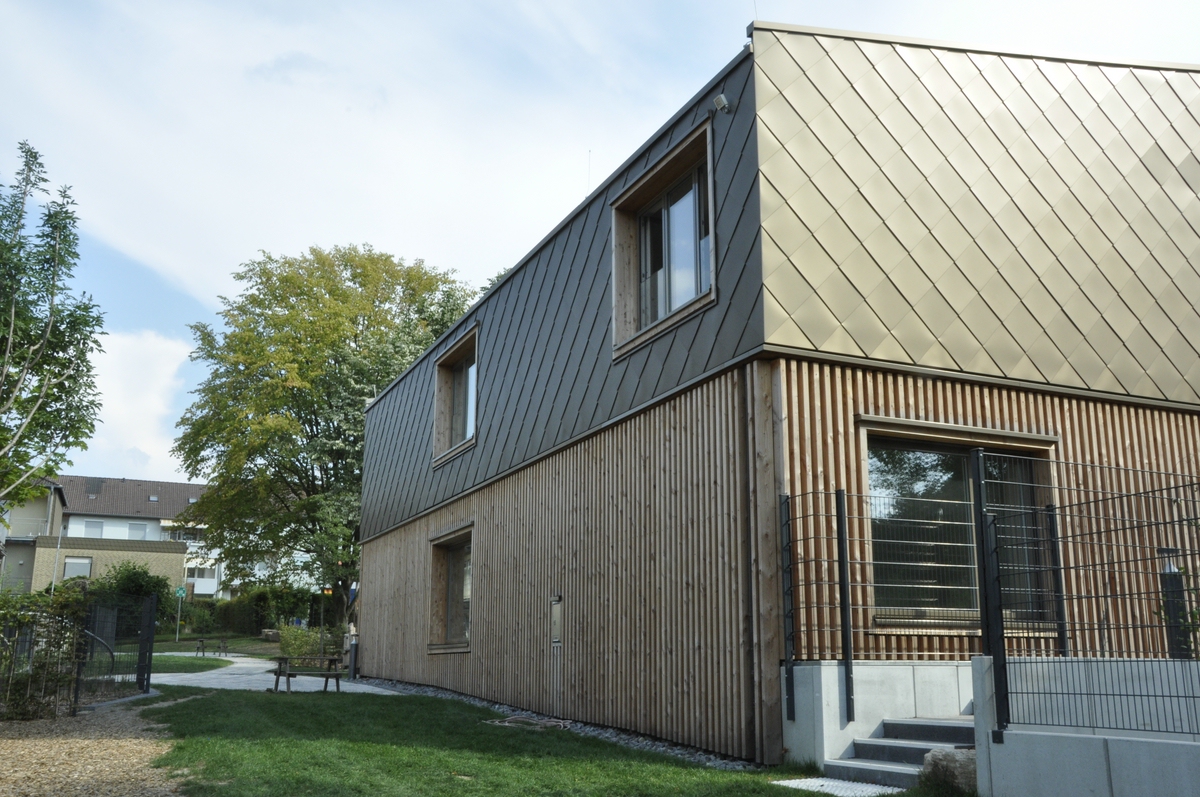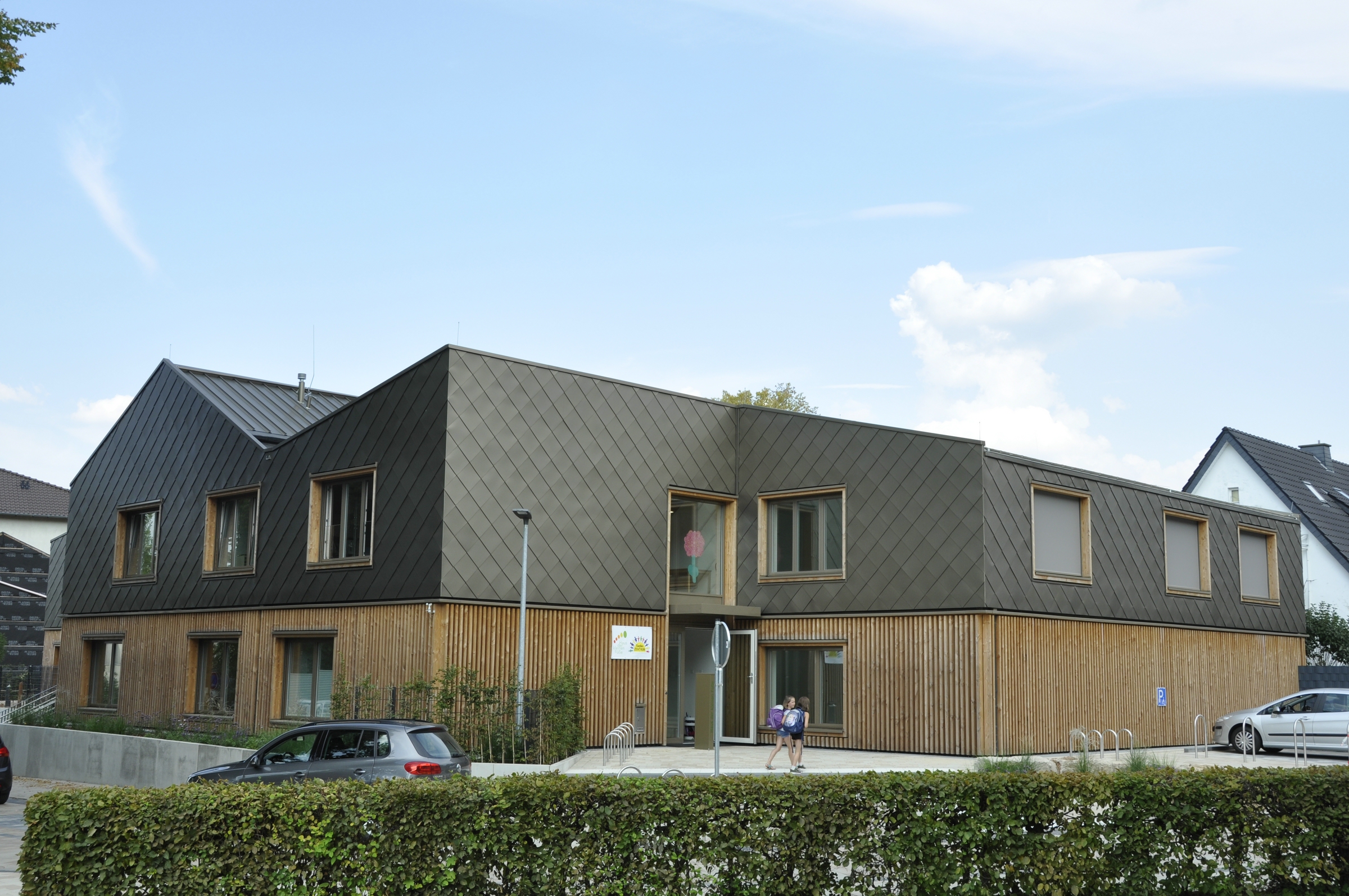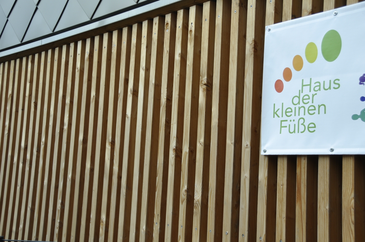 Der Neubau der Kita „Haus der kleinen Füße“ vereint Krippe und Kindergarten unter einem Dach. Das in Hybridbauweise errichtete Gebäude bietet helle, offene Räume, die Geborgenheit ausstrahlen. Wir realisierten die Außenwände, die Dachkonstruktion sowie die gesamte Holzfassade. Die Fenstereinfassungen aus warmem Douglasienholz setzen natürliche Akzente, während die Kombination aus Aluminiumrauten im Sonderfarbton und einer senkrechten Douglasie-Echtholzverkleidung ein lebendiges, hochwertiges Erscheinungsbild schafft. So entsteht ein Ort, der Funktionalität, Nachhaltigkeit und kindgerechtes Wohlfühlambiente harmonisch miteinander verbindet.