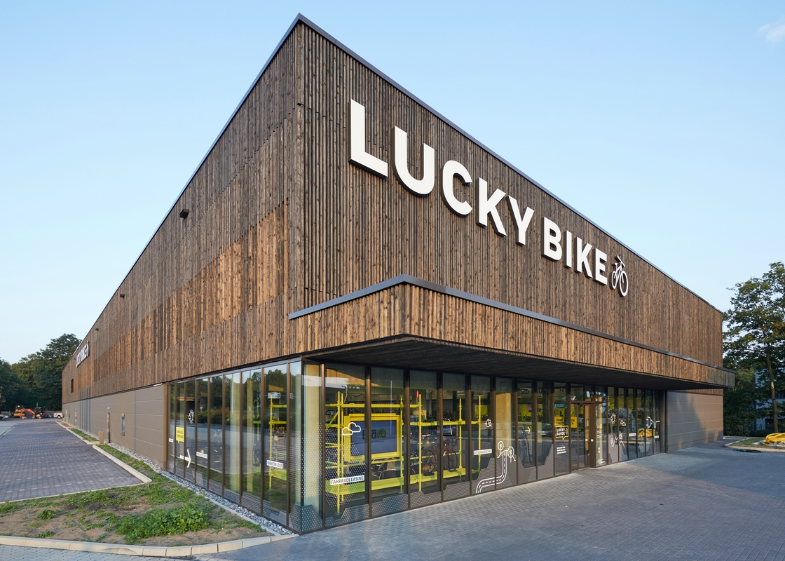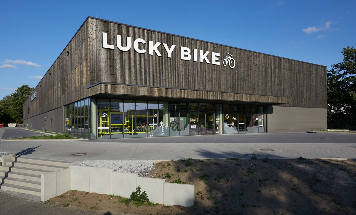 Für die Firma Lucky Bike, eines der größten Fahrradhandelsunternehmen Deutschlands, entstand eine markante Fassadengestaltung innerhalb einer insgesamt nur sieben Monate umfassenden, äußerst knapp bemessenen Bauzeit. Die Fassade wurde in Holztafelbauweise errichtet und mit senkrecht verlaufenden, kesseldruckimprägnierten Holzlamellen als äußerer Hülle ausgeführt.