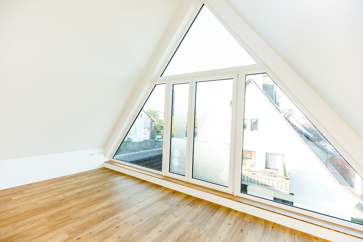 Helligkeit, wohin man schaut: Große Fensterflächen – mit prägnanten Dreiecksfenstern bis hoch in die Giebel hinein – öffnen nicht nur den Blick, sondern lassen auch viel natürliches Tageslicht ins Innere. Auch hier fällt die freundliche Ausstrahlung sofort ins Auge.