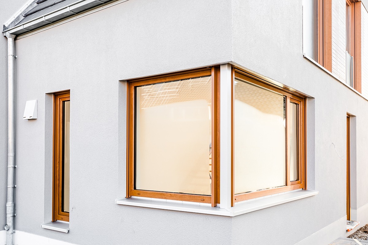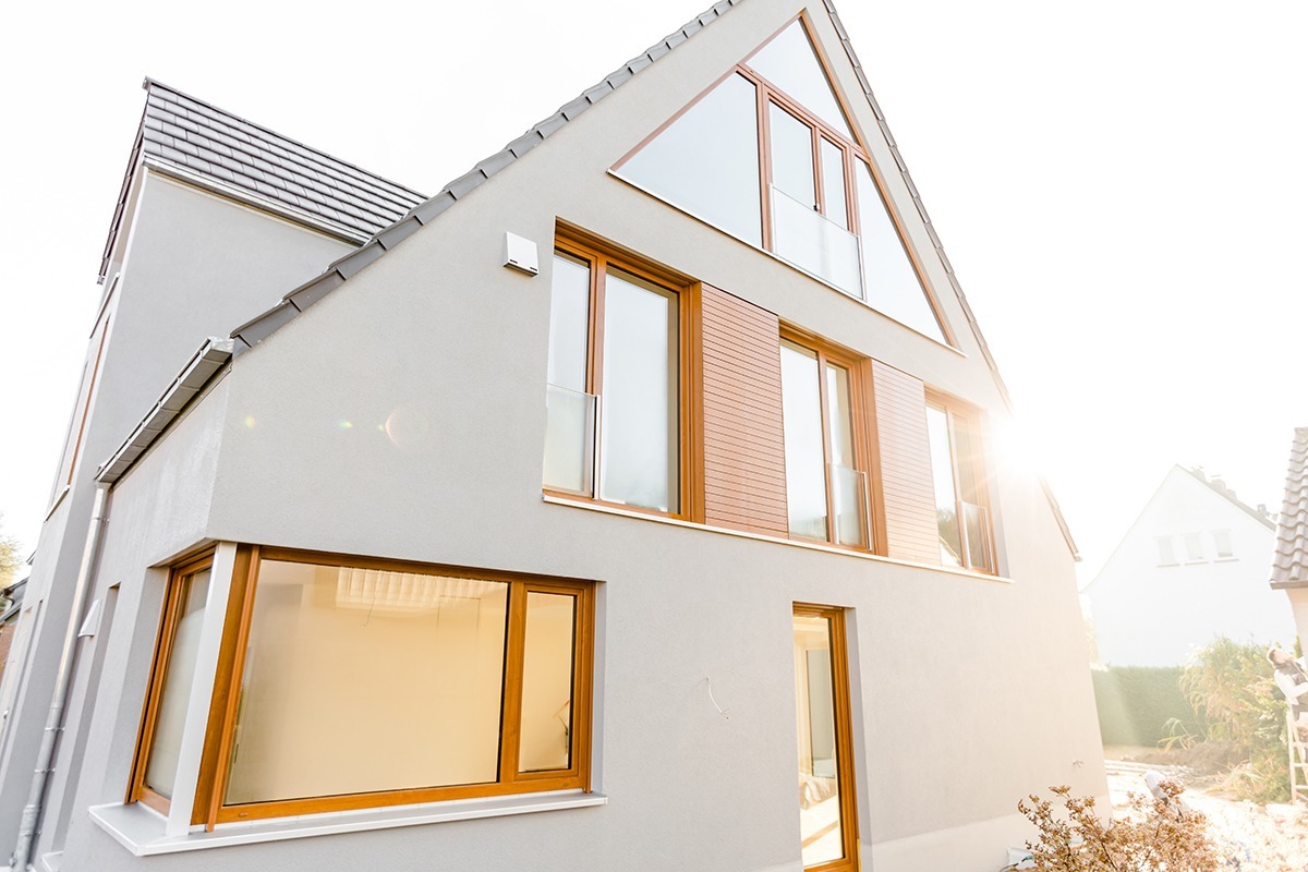 So überzeugt die Außenansicht von oben bis unten mit glatten Dachziegeln, einem hellen Putz und Fassadenelementen, deren Holzoptik perfekt auf das Erscheinungsbild der Fenster abgestimmt ist.