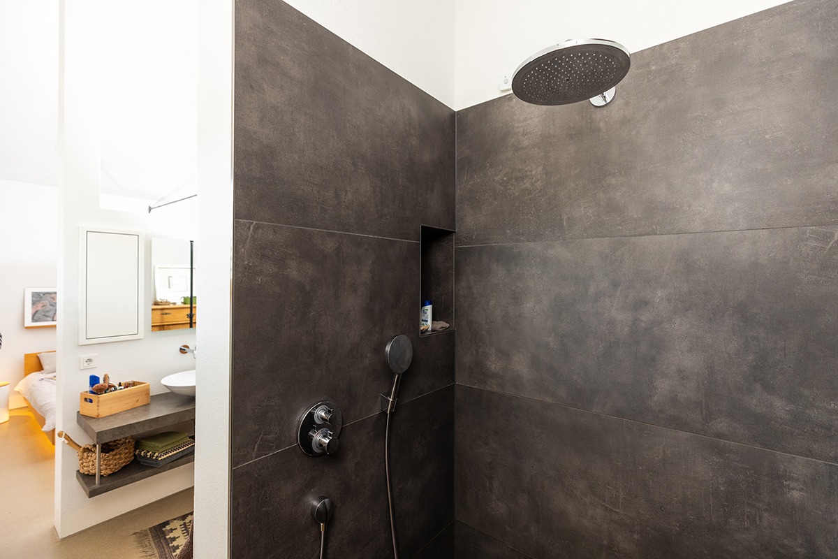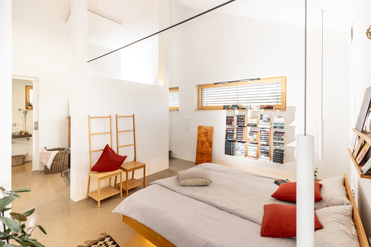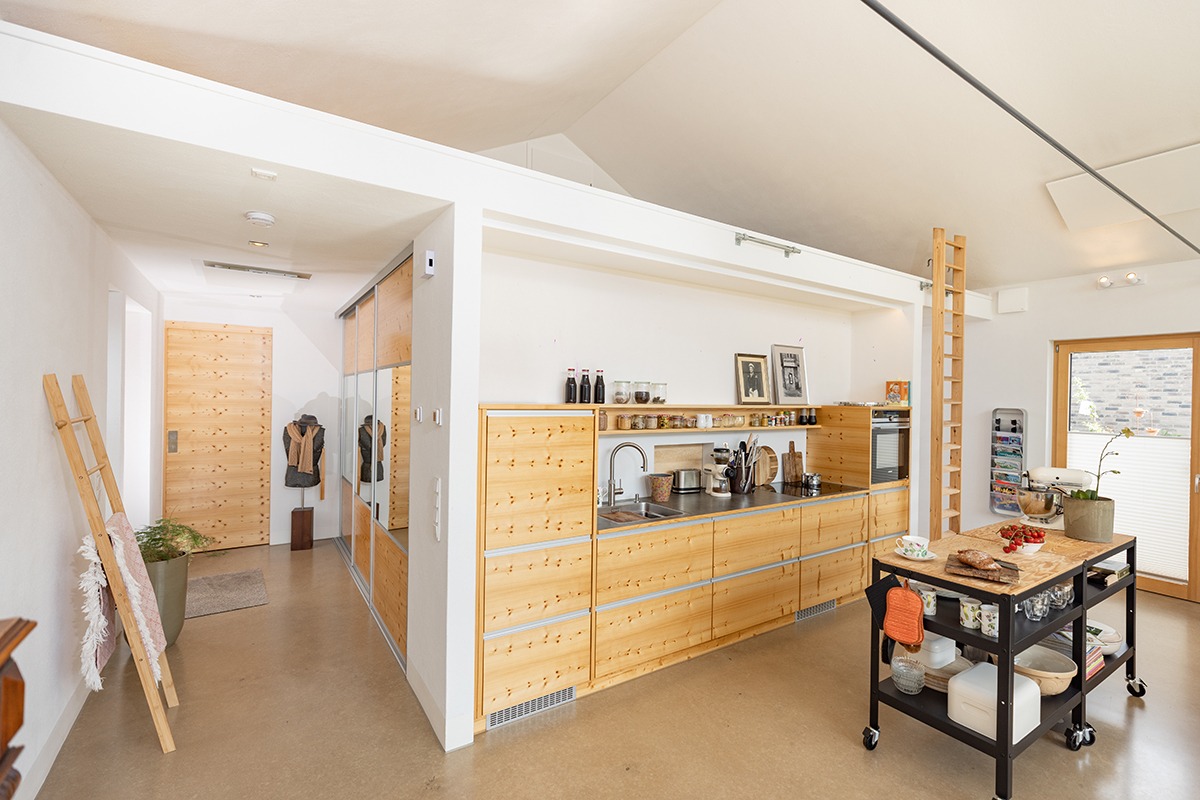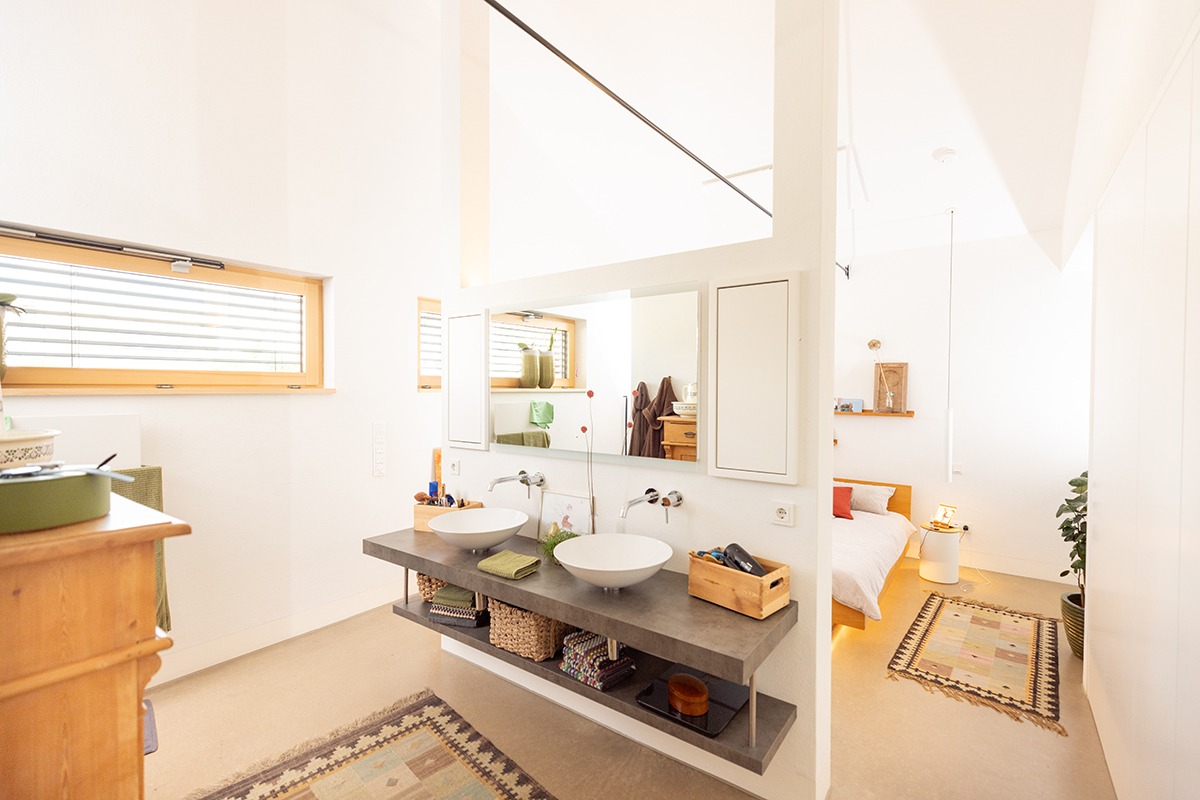 Eine dezentrale Lüftungsanlage mit Wärmerückgewinnung sowie eine Trinkwasserwärmepumpe für die energieeffiziente Warmwasserversorgung komplettieren die moderne Haustechnik. Der auf dem Dach erzeugte Strom steht außerdem per Wallbox für das E-Fahrzeug zur Verfügung – denn Nachhaltigkeit hat für die Bauherren einen hohen Stellenwert.
