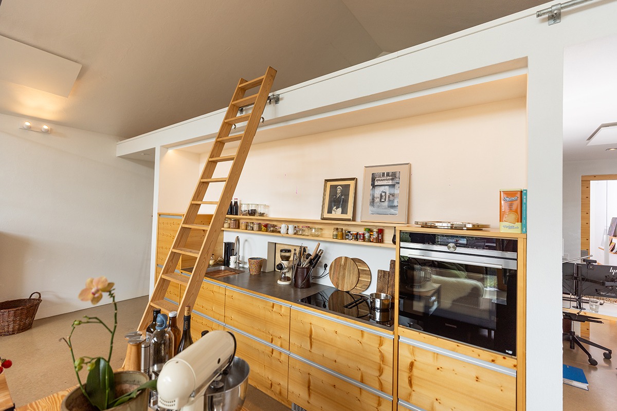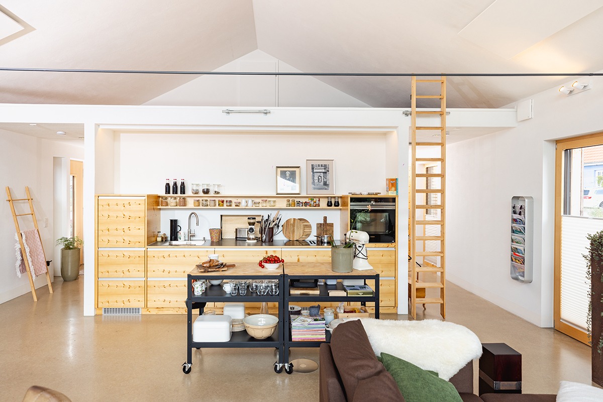 Unser „Smallhouse“ in Belm-Vehrte bei Osnabrück zum Beispiel ist 15 Meter lang und bietet dank smarter Raumnutzungskonzepte genug Platz für die beiden Bewohner. Die Außenwände und das Dach sind zusammen für das Abfangen der Gesamtlast zuständig. Innen werden also keine tragenden Wände benötigt, sodass der Raum absolut frei gestaltet werden kann. Einbauschränke und eine Zwischendecke für zusätzlichen Stauraum unter dem Dach sind hier wesentliche Bestandteile des flexiblen Konzepts.