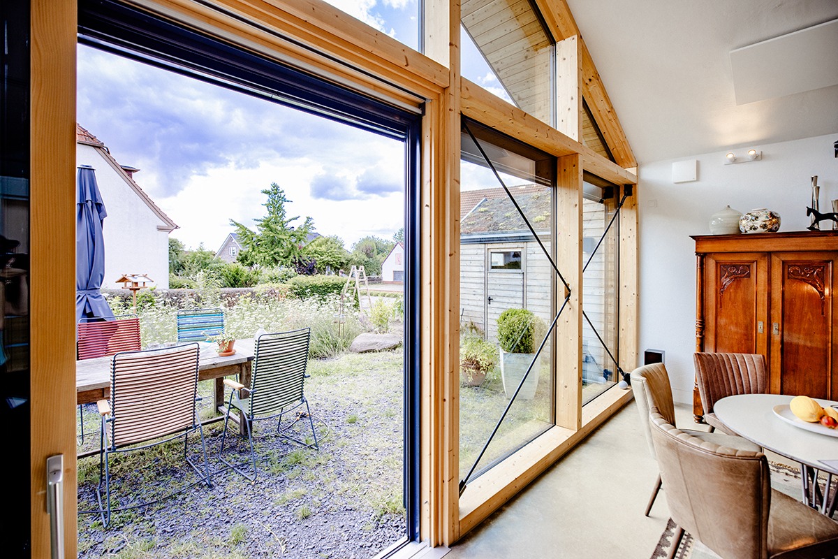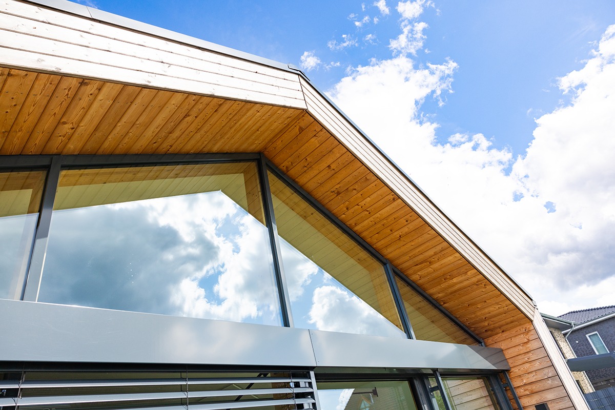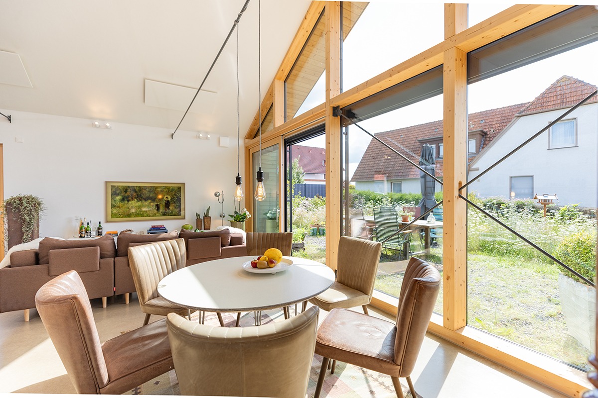 Vor allem aber soll es wohnlich sein. Die stilvolle Einrichtung seitens der Bauherren ist ein wichtiger Faktor – die praktisch komplett verglaste Giebelseite für einen schönen Ausblick und viel natürliches Tageslicht ein weiterer. Die Pfosten-Riegel-Konstruktion, ein breiter Dachüberstand, Raffstore-Verschattungen für die großen unteren Fensterflächen sowie die Sonnenschutzverglasung für die oberen Dreiecksfenster schaffen ein komplett stimmiges Gesamtbild.