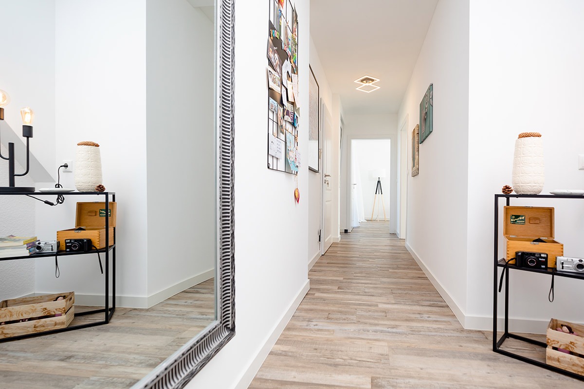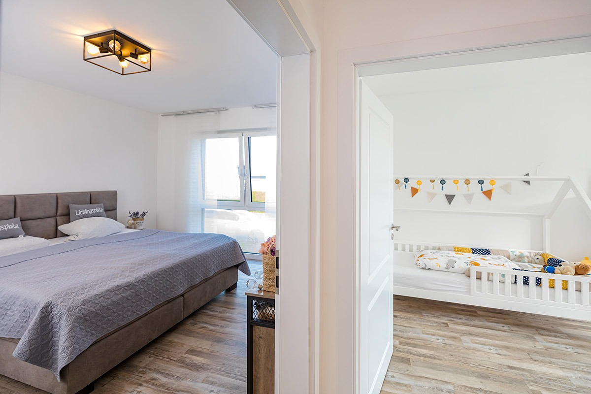 In baulicher Hinsicht ist der Anbau energetisch optimal umgesetzt; schließlich gehören dreifach verglaste Fenster und hochwertige Dämmungen bei all unseren Holzrahmenbau-Projekten längst zum Standard. Die Bewohner nutzten die An- bzw. Umbauphase zugleich als Gelegenheit für weitere Renovierungsmaßnahmen wie die Sanierung der Bäder und Fußböden sowie für den Austausch der Innentüren. Mit viel Eigenleistung wurden die beiden Etagen für modernes Wohnen auf den neuesten Stand gebracht. So führte die Wohnraumerweiterung in Belm mit relativ geringem Aufwand gleich drei Generationen einer Familie nachhaltig unter einem Dach zusammen.