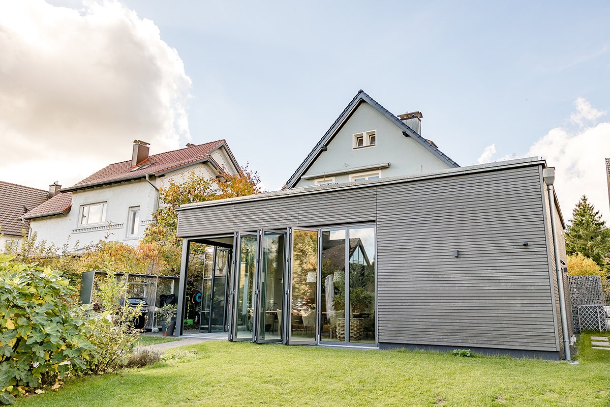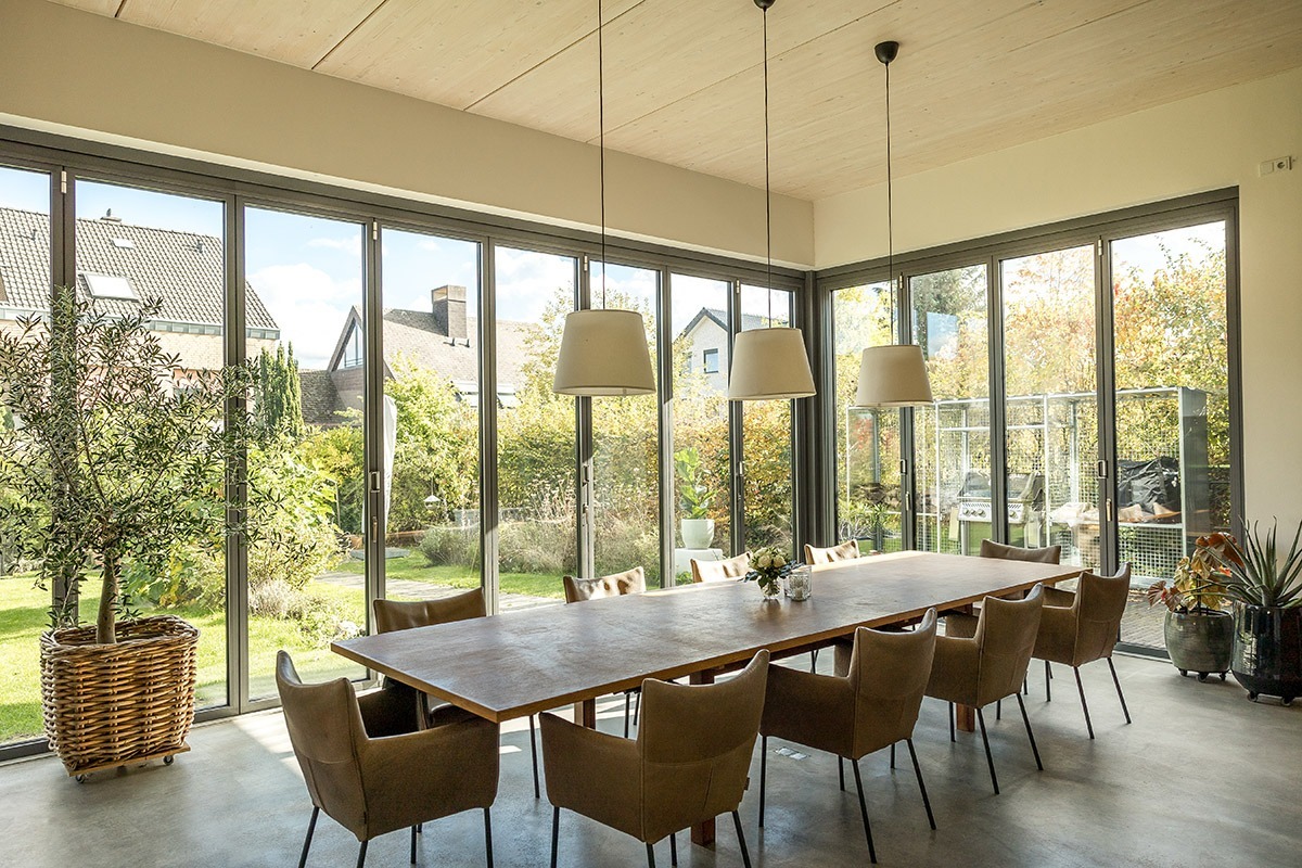 Ein wahres Highlight ist die riesige Falt-Element-Anlage, die das Leben drinnen und draußen bei schönem Wetter bestmöglich verschmelzen lässt. Auch im geschlossenen Zustand öffnet sich ein weiter Blick, und das großzügig hereinfallende Tageslicht unterstützt den freundlichen und einladenden Charakter des Anbaus.