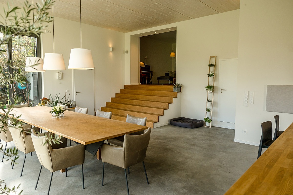 Dabei harmoniert die Treppe hervorragend mit der massiven, hell lasierten Holzdecke, dem langen Holztisch und den Küchenarbeitsplatten. Der Sichtbetonestrich, unter dem die effiziente Fußbodenheizung installiert ist, wurde geschliffen und oberflächenversiegelt und ergänzt das auf Ursprünglichkeit getrimmte Interieur ideal.